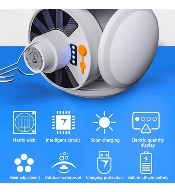 از ویژگی های دیگر این لامپ داشتن صفحه سولار می باشد و این خود می تواند بهترین کمک را در ذخیره انرژی داشته باشد، همچنین دارای میزان روشنایی 800 لومن و چراغ نشانگر شارژ در قسمت بالای لامپ نیز می باشد. منبع تغذیه لامپ توسط پنل خورشیدی و همچنین آداپتور می باشد. برای شارژ کامل لامپ، 5 ساعت زمان لازم است و با هر بار شارژ کامل، می توانید به مدت 6 تا 8 ساعت از نور آن استفاده کنید. باز شدن چهار ال ای دی این چراغ سولار زیبایی آن را دوچندان کرده است.سایز لامپ در حالت بسته (مدل توپ) 16x14x16 سانتیمتر میباشد در حالت سقفی باز 30x16x30 سانتیمتر می باشد.